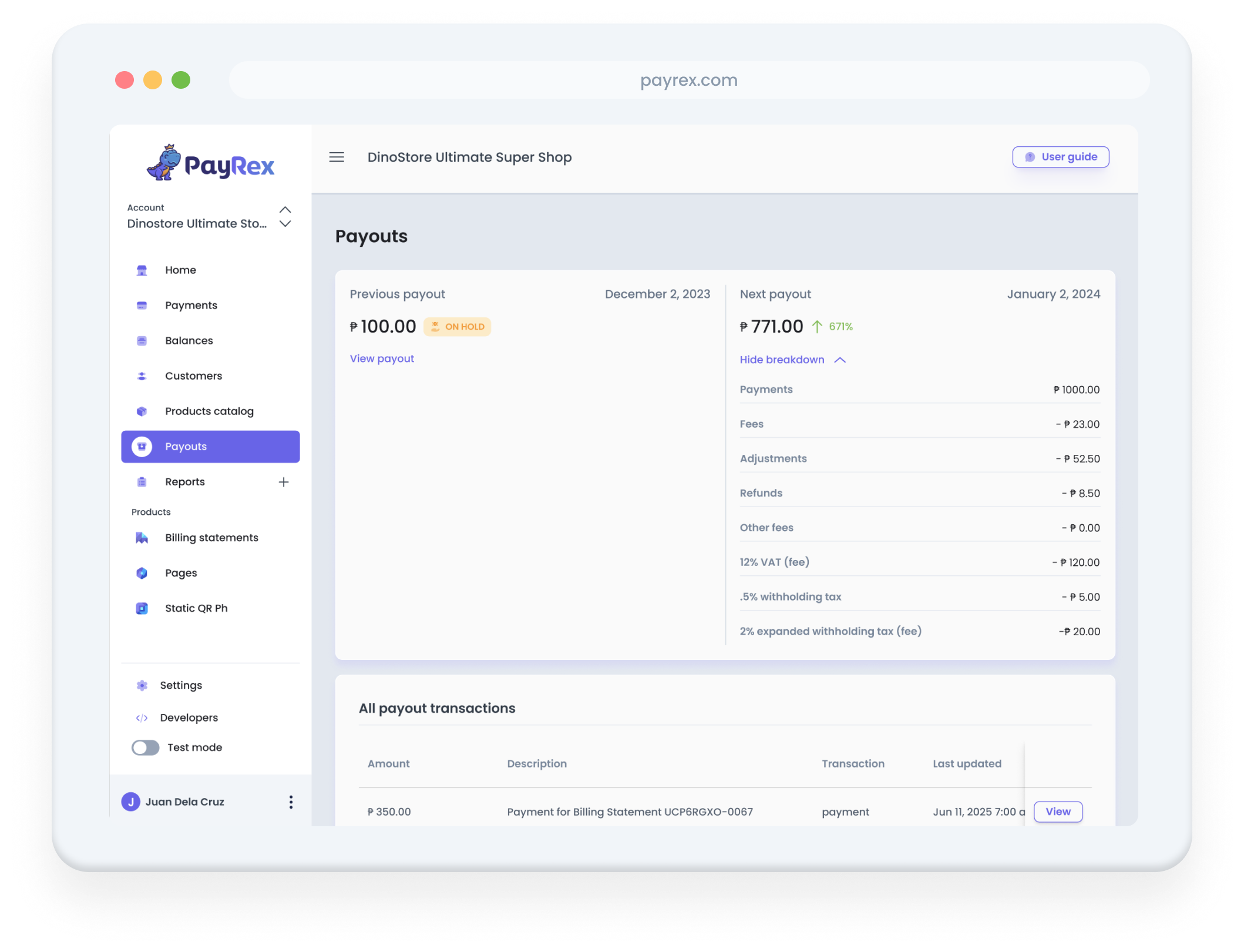 A payout is the net amount of money settled to your nominated bank account. It represents your successful transactions minus any applicable PayRex fees and taxes. Whether you are using our API for custom integrations or our no-code tools like PayRex Pages and Billing Statements, all your earnings are consolidated into these scheduled settlements.